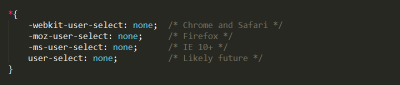You should also add the CSS code to ensure that none of the text or the images in the game are selectable. Use the * to apply the style to ALL elements: