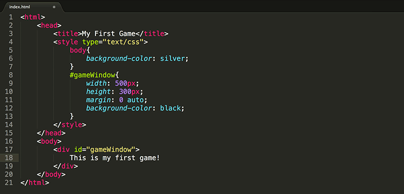 - If there is more too much content for one line between an open and close tag, use multiple lines and indent everything between the tags. This is what was done with the html, head, body, and style. Note that the div also is done in this way even though there is little content between the open and close div tags. This is because you will be putting more code here later!