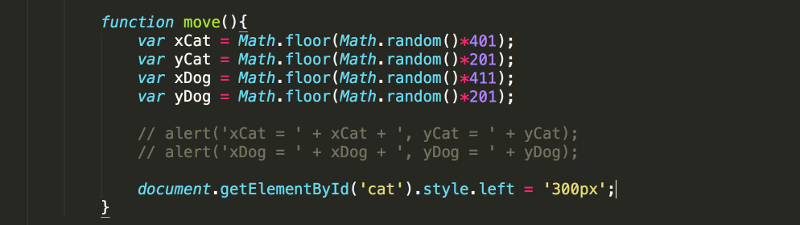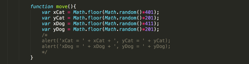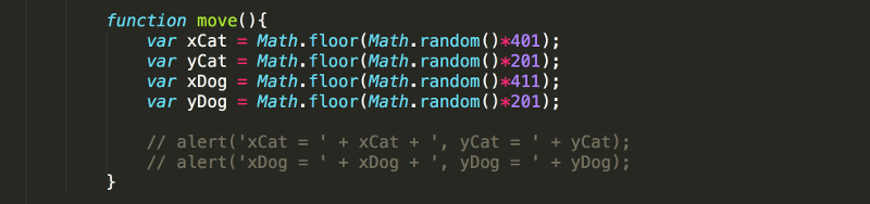 1. In the previous lesson you create random numbers which you will now use to re-position the cat and dog every time the Move button is pressed. Start by commenting out the lines of code with the alerts.