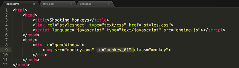 4. In the HTML, give the image an id of monkey_01. You will use this id in JavaScript to select the image. Remember document.getElementById()?
