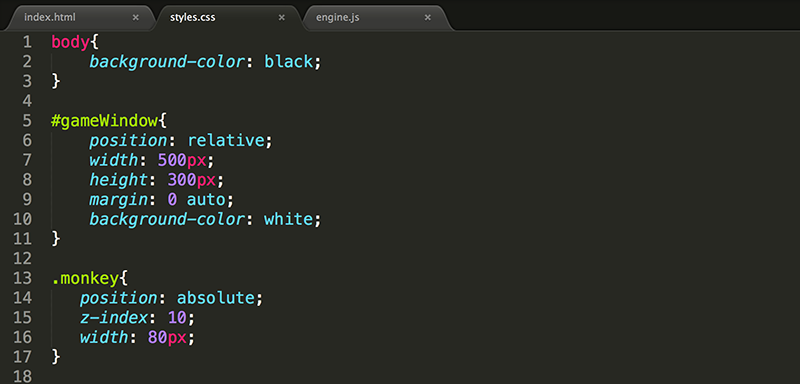 In this way, if you add additional monkeys, they will all have the same z-index and all have an absolute position (relative to gameWindow). If elements have the same z-index, those that appear higher in the HTML code will be in front of those that appear lower.