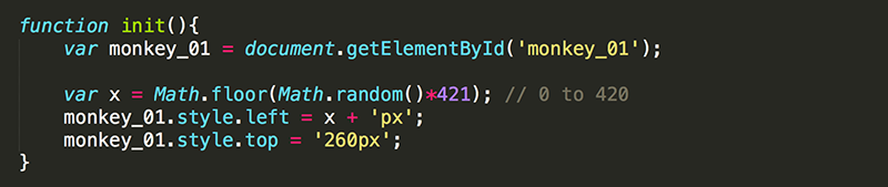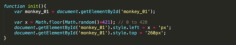 4. Set the monkey's left property to a random number between 0 and 420px.