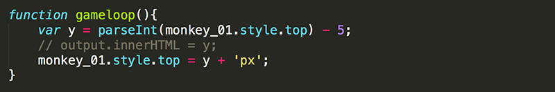 The variable y (commonly used for the vertical location of an element) is declared inside gameloop so can only be used within this function. The variable monkey_01 was declared outside of any function so may be used anywhere. You are setting y to equal the monkey_01's vertical position. The output variable (which was set equal to the output div) in the init() is being used to display the value of y.
