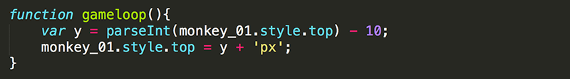 4. You need to change the top value of monkey_01 to equal the new y value you calculated, which is always 5 less than its current value. Each time gameloop runs, the actual vertical position of monkey_01 should decrease.
