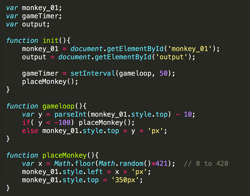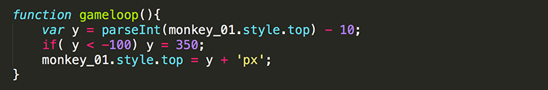5. You can also simplify gameloop() by replacing the redundant code with a call to placeMonkey(). Note that you are now using an if/else statement. If y is less than -100, placeMonkey() will be called to reset monkey_01 to a new starting position. However, if y is not less than -100, monkey_01 will be moved up 10 pixels to the new y value.