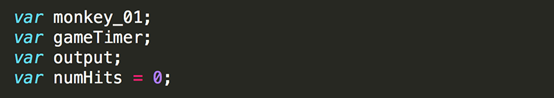 5. Next you want to keep track of the number of times you have clicked on a monkey. Create a variable named numHits for this with an initial value of 0.
