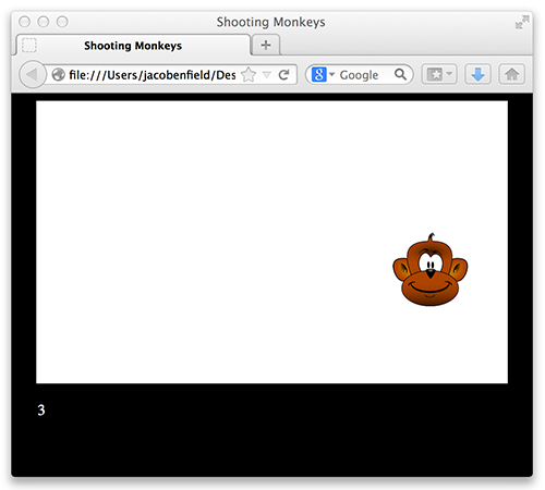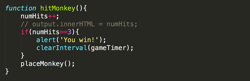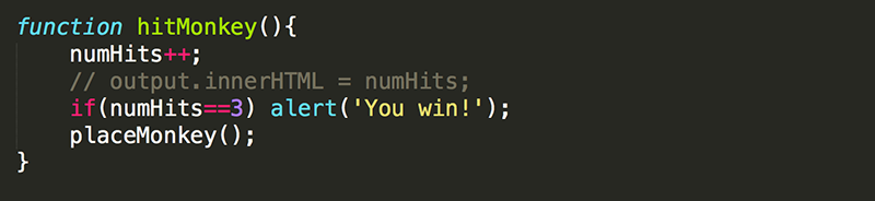 4. You were just using output to test that our onclick was working; so now that you know it is working, comment out the code. What you really want to do is have the monkey dissappear when it is clicked on, and start over from a new position. Luckily, you already created placeMonkey() to do this.