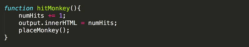 6. Each time the monkey is clicked on, the current value is increased by one. Note that a single equal sign is an assigment operator. In this case you are assigning a new value to numHits that is the current value of numHits plus one more.