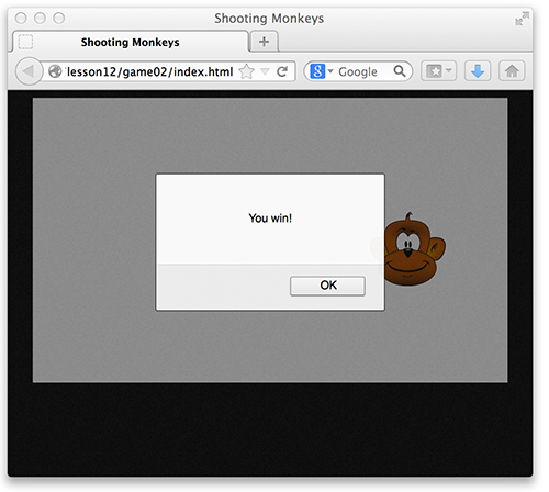 Add a conditional statement that will announce the player has won after they click on three monkeys.