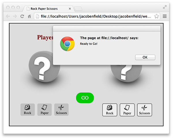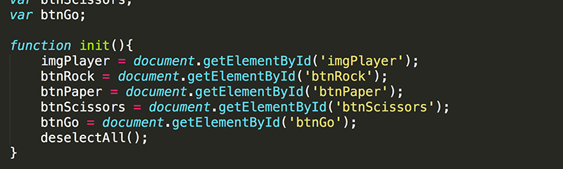 Later we will modify the code to have the computer randomly select rock, paper, or scissors. However, we don't want the player to be able to press the GO button until they have first selected rock, paper, or scissors themselves.