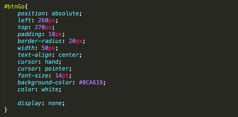7. In the CSS sytle for #btnGo, replace the visiblity: hidden; with display: none;.
