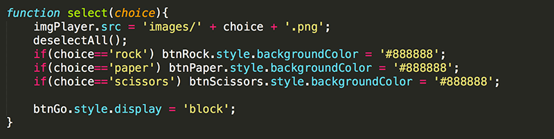 5. Add the line of JavaScript code to change the visibility of btnGo to visible. Place it in the select() function because that is when you want it to appear (when the player selects rock, paper, or scissors).