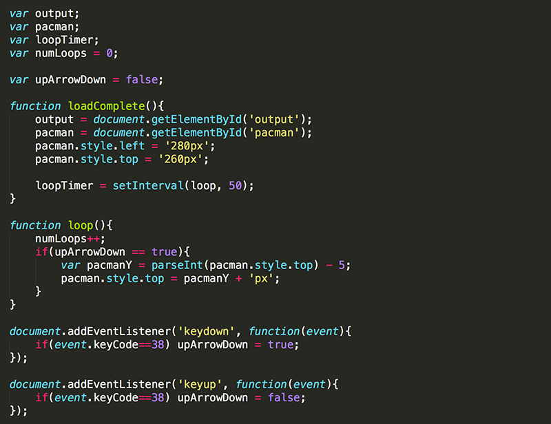 Lastly, update loop() so that pacman is moved up if upArrowDown==true each time the Game Loop is executed (every 50 milliseconds).