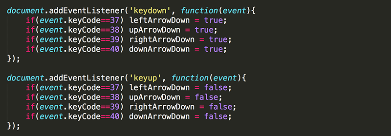 Modify the 'keydown' and 'keyup' event listeners so that they change the value of upArrowDown to true when the up arrow key is pressed and to false when the up arrow is released. In this way, you may use upArrowDown anytime to check whether or not the up arrow is being pressed.