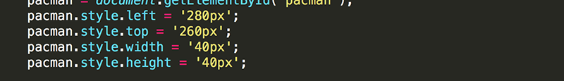 Declare originalLeft and originalTop and set them equal to pacman's left and top values. At the bottom of the 'keydown' event listener, change pacman's left and top back to these original values. This will allow you to move pacman anywhere for testing purposes, knowing he will be reset to his original position.