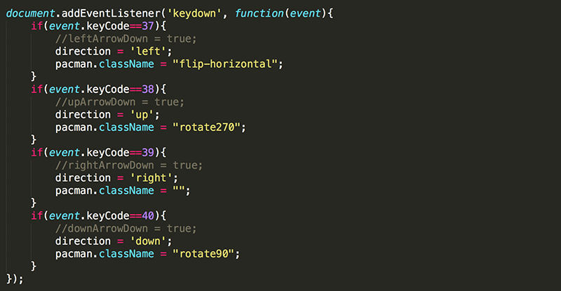 11. In the 'keydown' event listener, replace the assignments for the variables for tracking which arrow keys are being pressed with the appropriate assignments for direction.