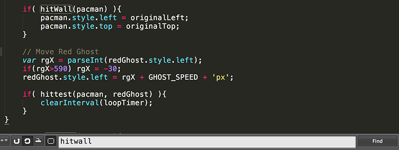 10. Use Find to search for all the instances of the hitWall() function call and replace them with hitWall(pacman).