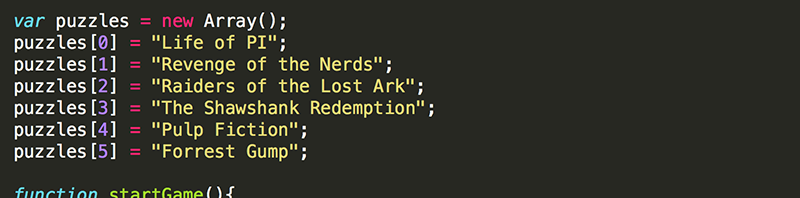2. Create an Array to store all the possible puzzles. Feel free to make up as many puzzles as you wish. You can stick to a theme, such as movie titles if you want.