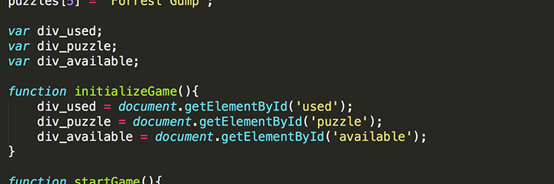 Creating variables with the same name as the id of the element that the variable will be set equal to sometimes makes it easier to keep track of what the variables are for. However, in this case, use the prefix div_ when naming the variables. This will help you remember that the value of these variables are div objects. It also will allow you to use the more generic names (such as puzzle) for other variables, as you will do in a moment.