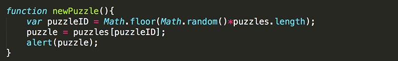 5. Add puzzle as a global variable to store the randomly selected puzzle, and modify newPuzzle() to set its value. Add in the alert to ensure that the value of puzzle is being set correctly.