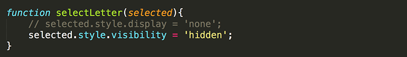 5. Create the selectLetter() function. For now, just have the function hide the element that was clicked on.