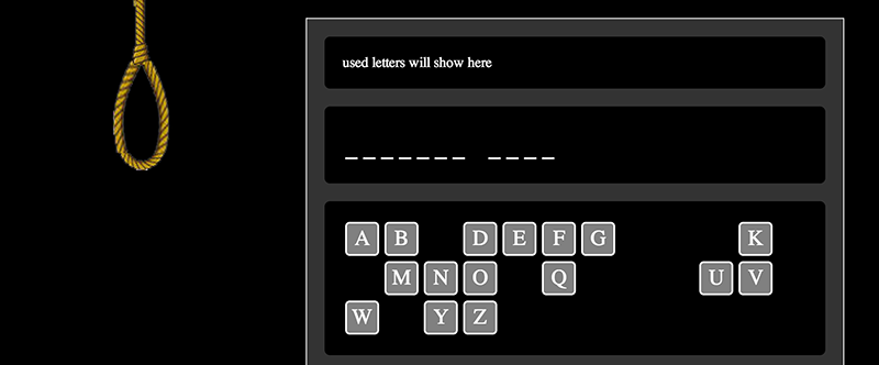 3. In the JavaScript, create alphabet as a String that holds all the letters of the alphabet. Remember, you can use this String as an Array of characters. In the initializeGame() function, add code to create a button div for each character of alphabet (applying the btnLetter class and adding the letter inside the div) and add the button to the div_available div.