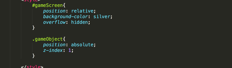 In the CSS, notice the width and height of the gameScreen is not set. This is done in JavaScript. Also note that a style for all elements with the gameObject class is provided.