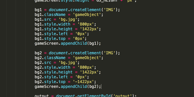 3. In the init() function, create two img elements (saved to bg1 and bg2) for the background and add them to the gameScreen. Look in the project files folder and notice bg.jpg was created with the appropriate width of 800px, but a much larger height (1422px) than the gameScreen. These values are also set in the JavaScript. While bg1 is placed at the top, left corner of the gameScreen to be immediately visible, bg2 is placed just above the gameScreen.