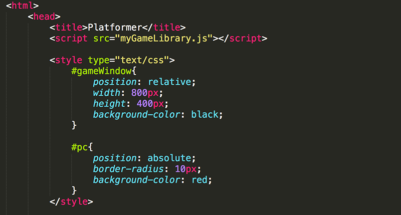 These elements are styled in the CSS so that the red pc is positioned relative to the black gameWindow. Note there is also a link to the myGameLibrary.js file that has the hittest function you used in previous lessons.