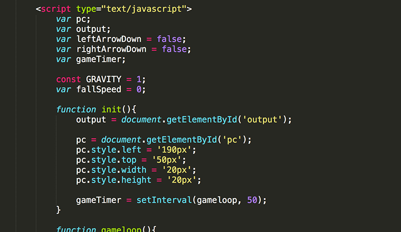 The JavaScript includes the declaration of global variables (and one constant). The init function sets the initial size and location of the pc and starts the game loop.