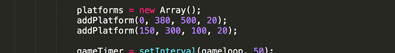 In the init function, set platforms to an Array and add a function call to addPlatform. This function will create and add a new platform given the location (x and y position) and the size (the width and height).