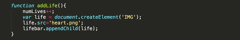 Create the addLife() function to increase the value of numLives by one, create a new img element with a src of heart.png (which was included with the project files), and then add that img element to the lifebar.