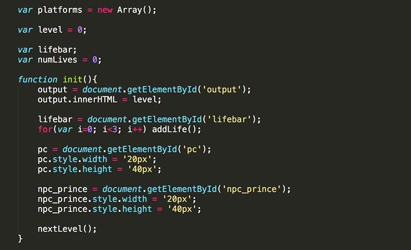 Initialize the global platforms variable to a new Array. This is important because if platforms has no value when platforms.length executes in nextLevel(), the code will crash. A variable with no value does not have a length property. An Array does, even if that length is 0.