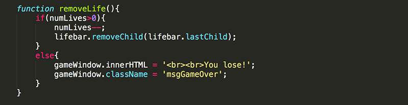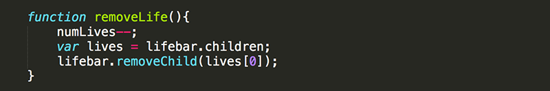 Create removeLife() so that it reduces numLives by one and then removes one of the hearts from lifebar.