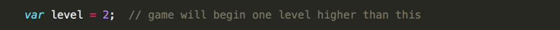 For testing purposes, it is nice to be able to have the level you are currently working on load immediately. Because of how you structured your code, this is easy to do. For instance, if you want to test out level 3 as you are working on it, you would simple intialize level to 2...